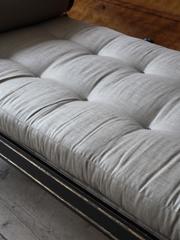 The upholstered scrolling end supports supported on splayed legs with ornate brass castors. Re-upholstered in pale grey English linen. English, circa 1800. H:60 W:206 D:70 CM (Seat Height 40 cm.) H:23.6 W:81.1 D:27.5 INCHES (Seat Height 15.7 inches)