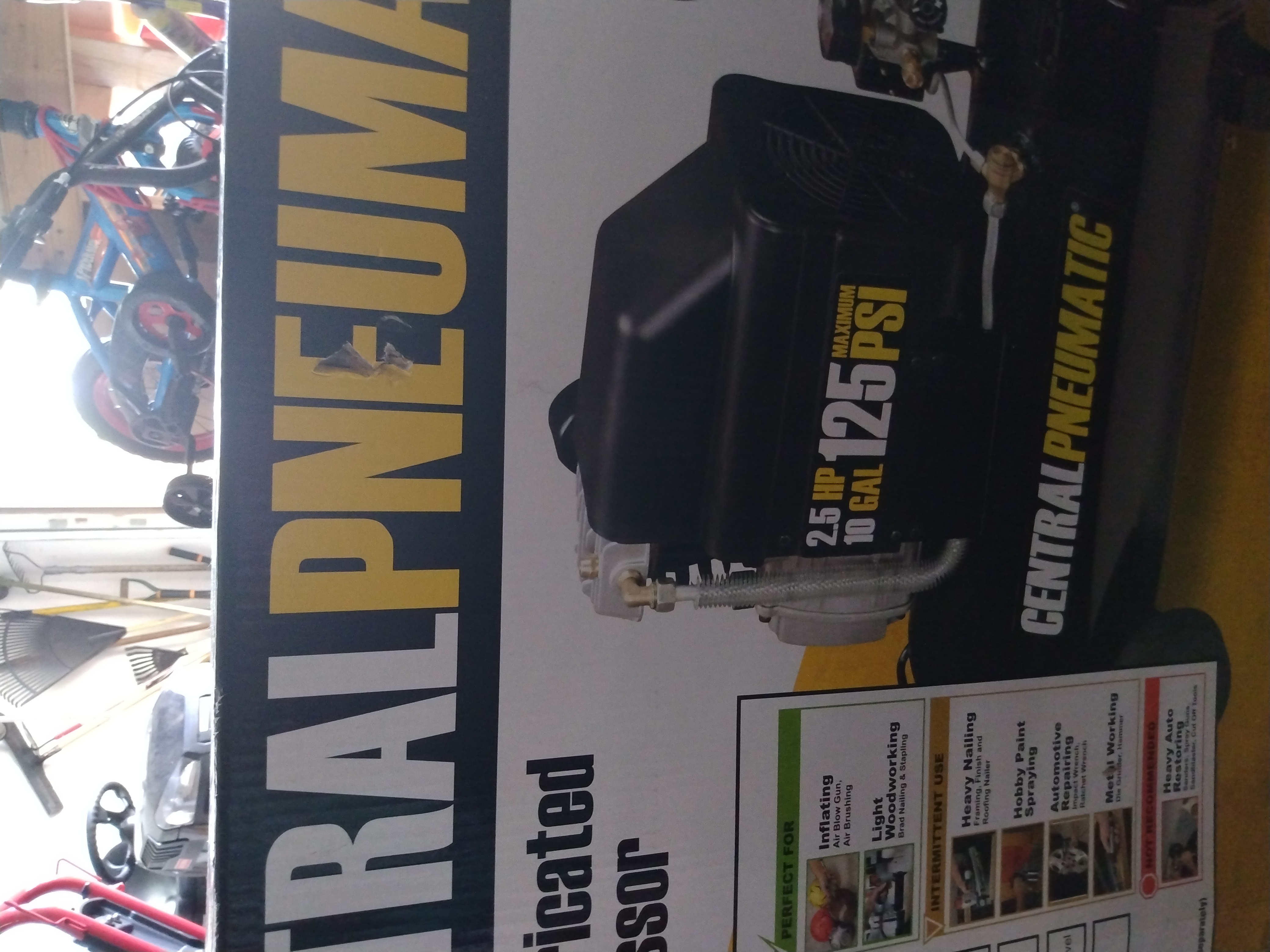 This is a New Central Pneumatic Oil Lubricated 2.5 HP, 10 Gallon, 125 Max Psi ,1 tank System.Well kept and stored inside my late brother Garage.